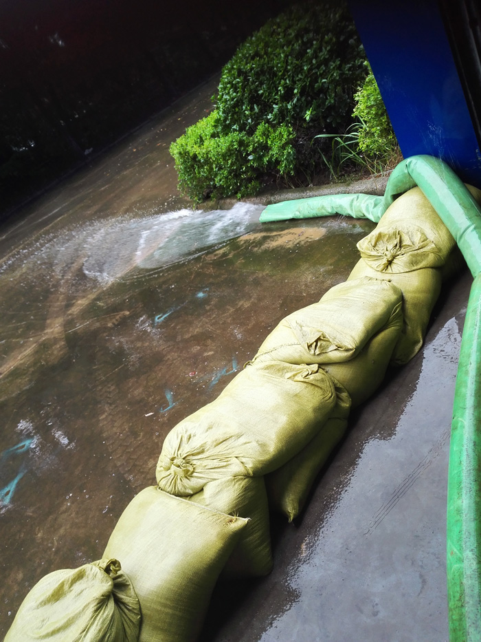 “運河水位離碼頭最低處還有4公分!”每年老廠區是遭遇洪澇災害的重點部位,在連日大雨的侵襲下,7月3日中午,老廠碼頭水位漲至今年最高。十多名員工迅速將黃沙裝袋,堵住離河岸最近的開平車間的兩個大門,以防水患。隨著雨勢漸弱,水位不再上升,至今晨4點,水位已有明顯下降。新譽碼頭度過該次險情。此外,老廠區的風電塔筒車間積水較嚴重,但參與防汛抗災的員工及時排水,車間內電纜等設施設備未受到嚴重影響。
